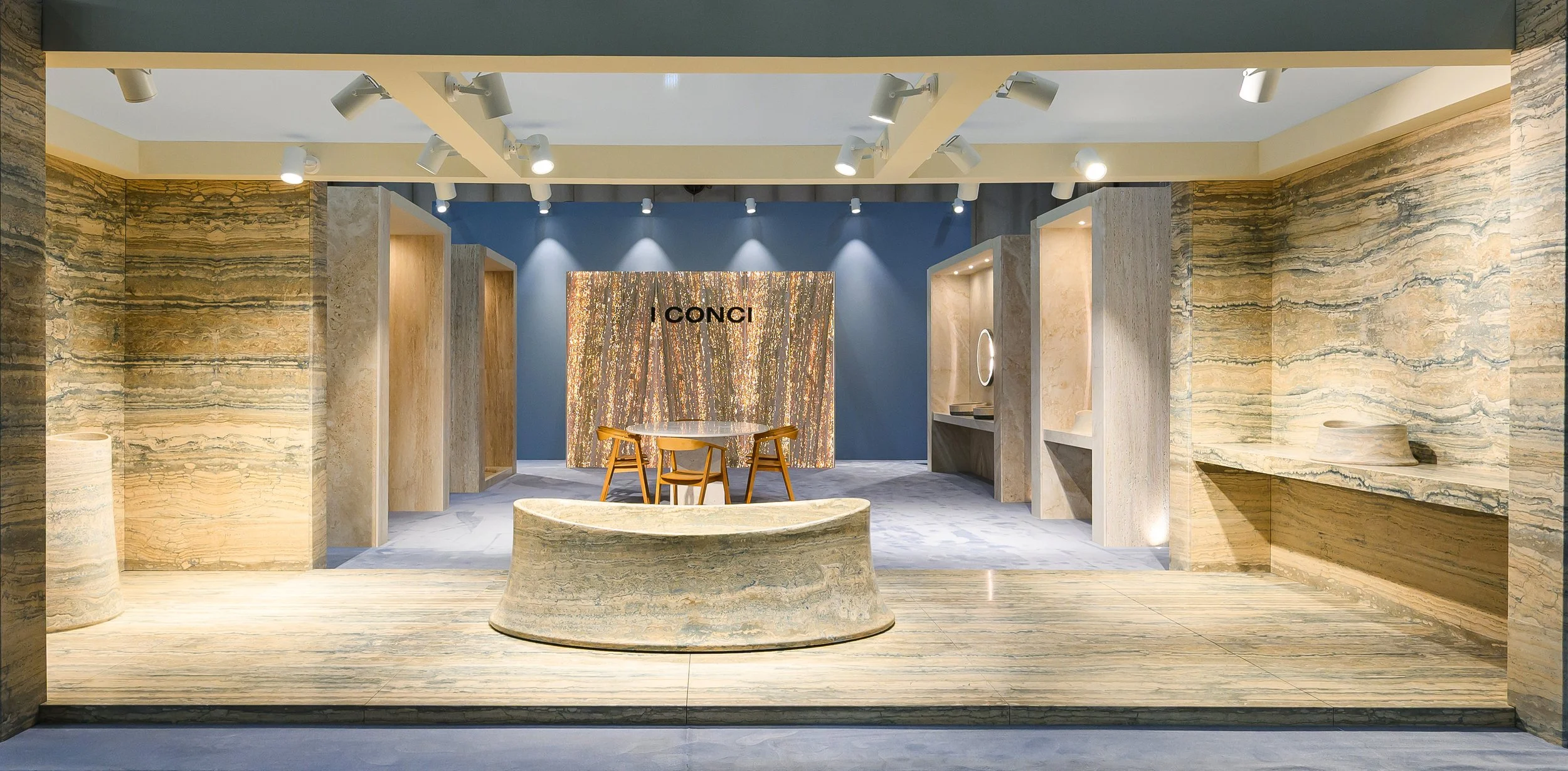 Ultimately, the design seeks to highlight the essence of the work of I Conci:Travertine, tradition, innovation, stonework, attention to detail and variety of combinations.