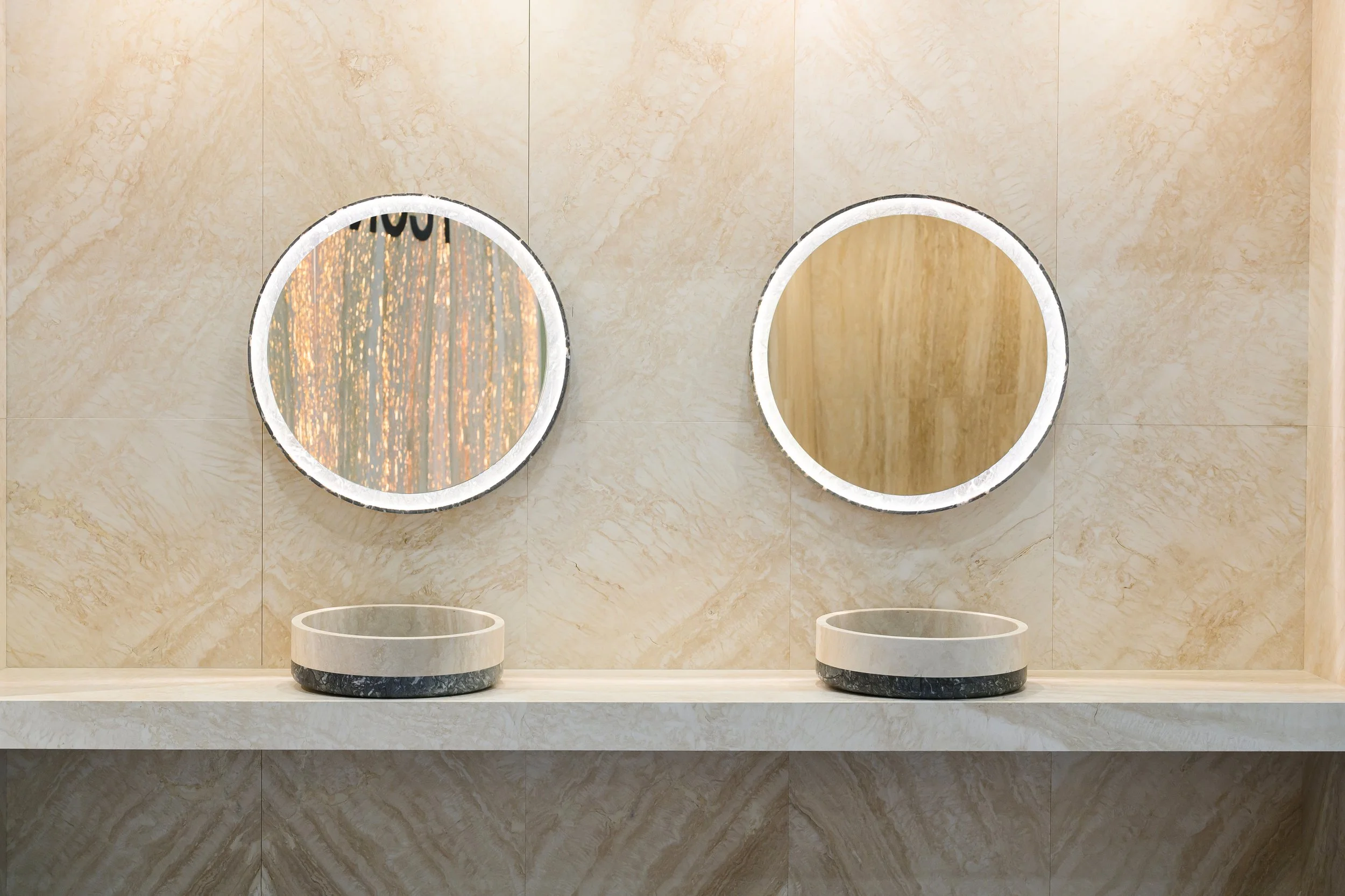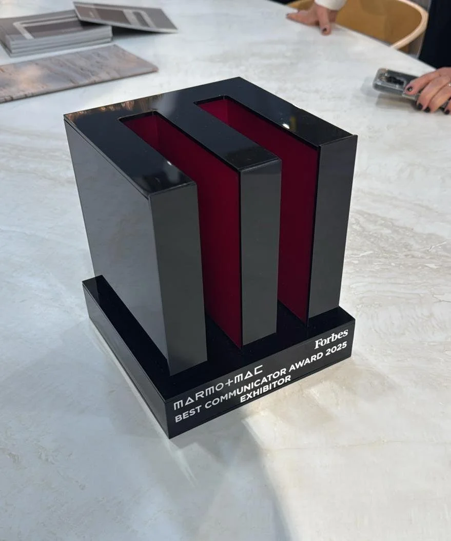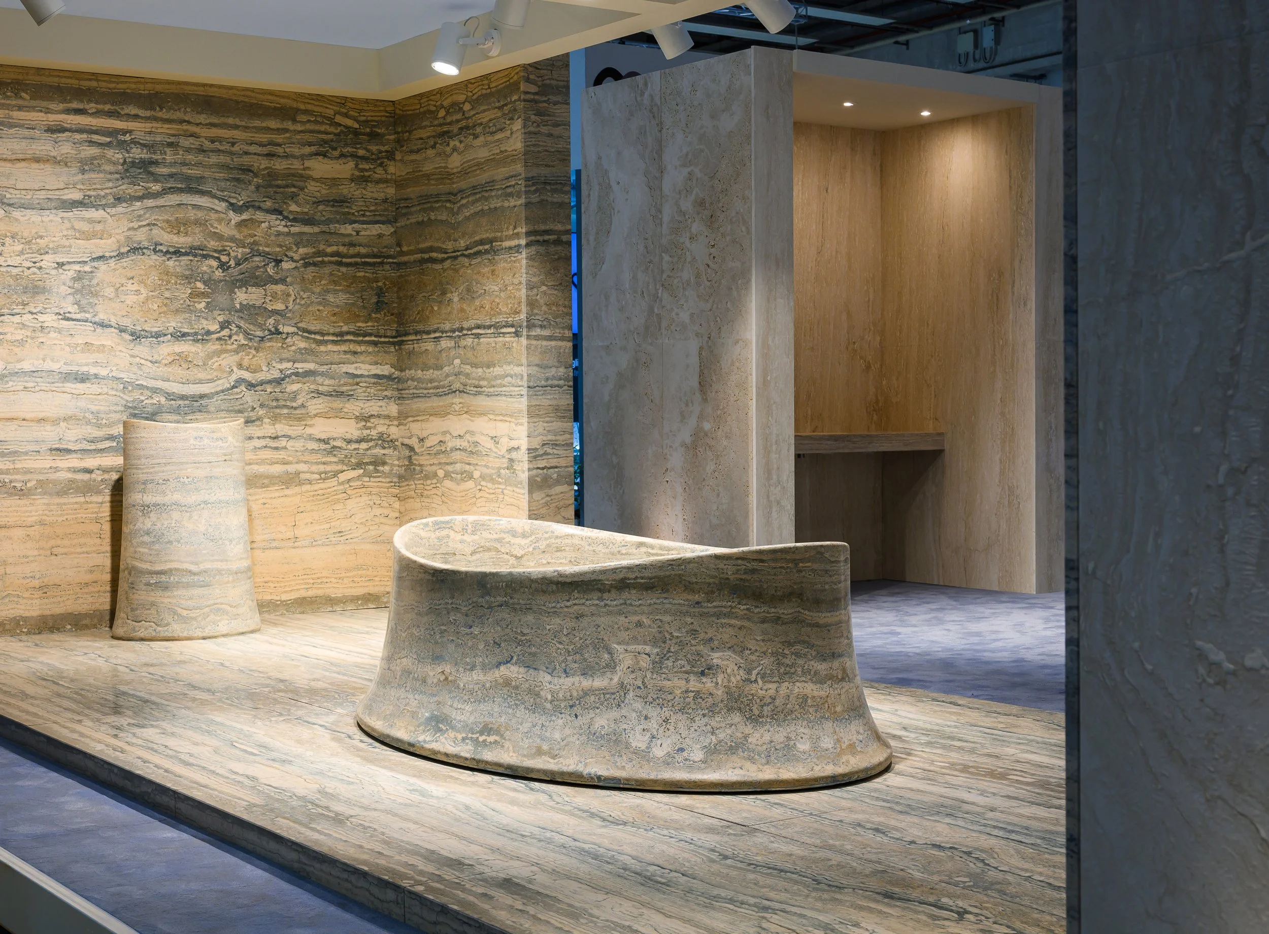 The assignment to design the entire stand at marmomac 2025 is in line with the brand's intention to renew its image through the launch of two new product collections under the creative direction of b&a. behind the main scenography, the stand is articulated through a sequence of monolithic boxes, each showcasing a different travertine treatment on the exterior and a distinct typology on the interior. these volumes act as silent stages where the pieces of the collections emerge as sculptures, allowing visitors to read the material, its finishes, and its expressive potential through a curated spatial rhythm. the stand was awarded the marmomac–forbes best communicator award for its concept—simple yet highly elegant—recognized for the coherence of its material language and its remarkable ability to capture and hold the visitor’s attention through the expressive power of marble.