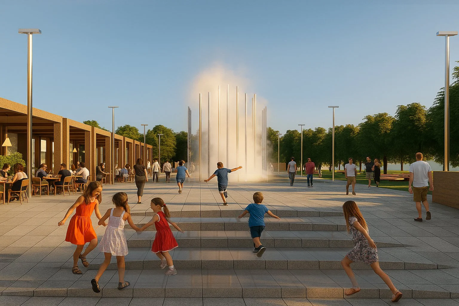 Alongside the reflective plane, a “suspended mist” introduces an atmospheric and sensory dimension — a light cloud that appears and dissolves, shaped by wind, light, and human presence. The square becomes a living landscape, constantly changing, immersive, and open to interpretation.
