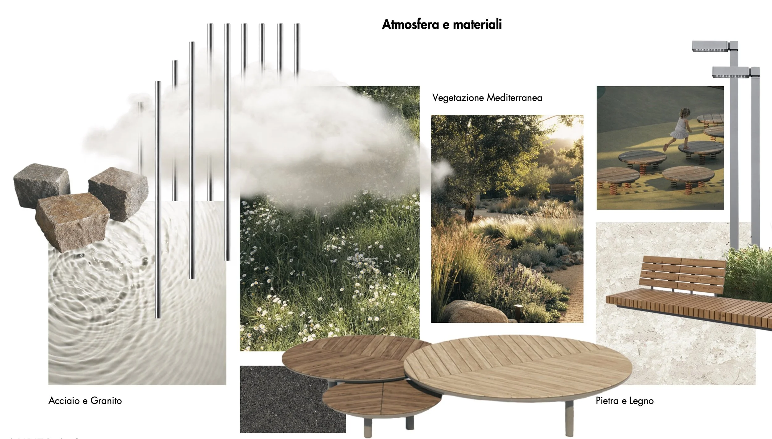 Essential materials — granite, stone, wood, and steel — integrate with Mediterranean vegetation, while existing seating elements are regenerated, creating a dialogue between memory and contemporaneity.