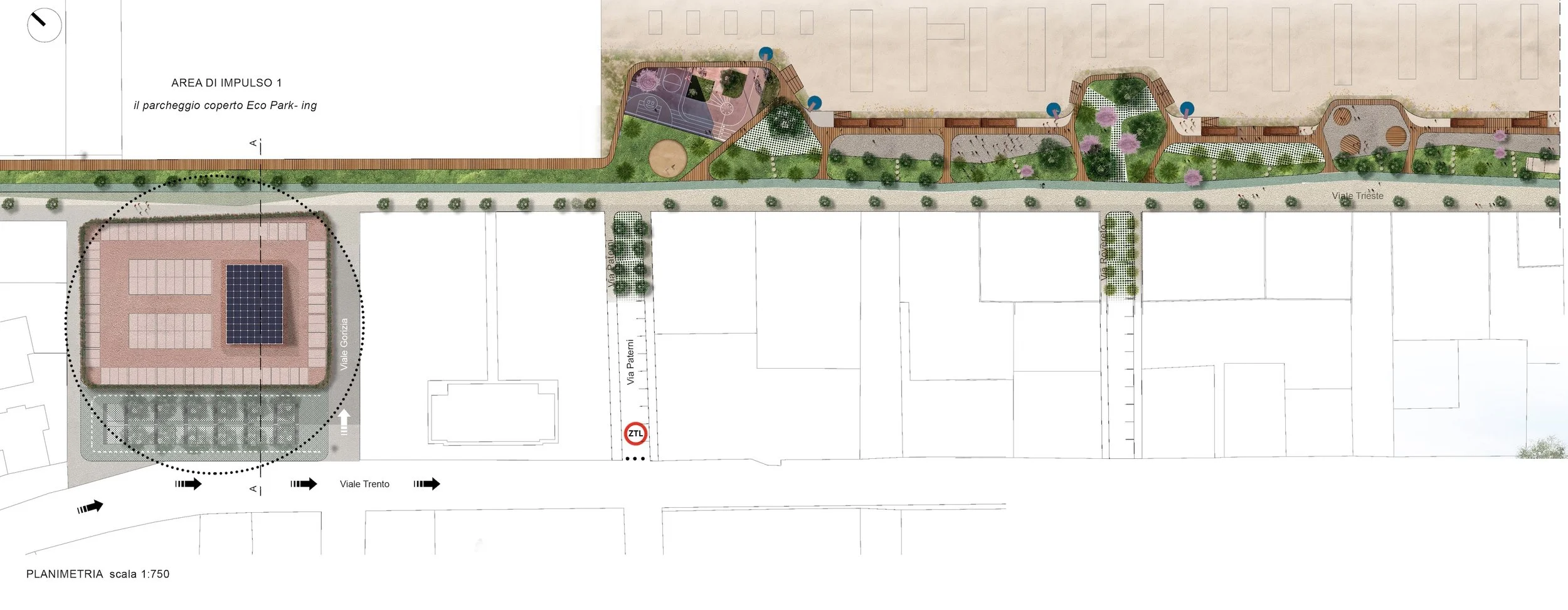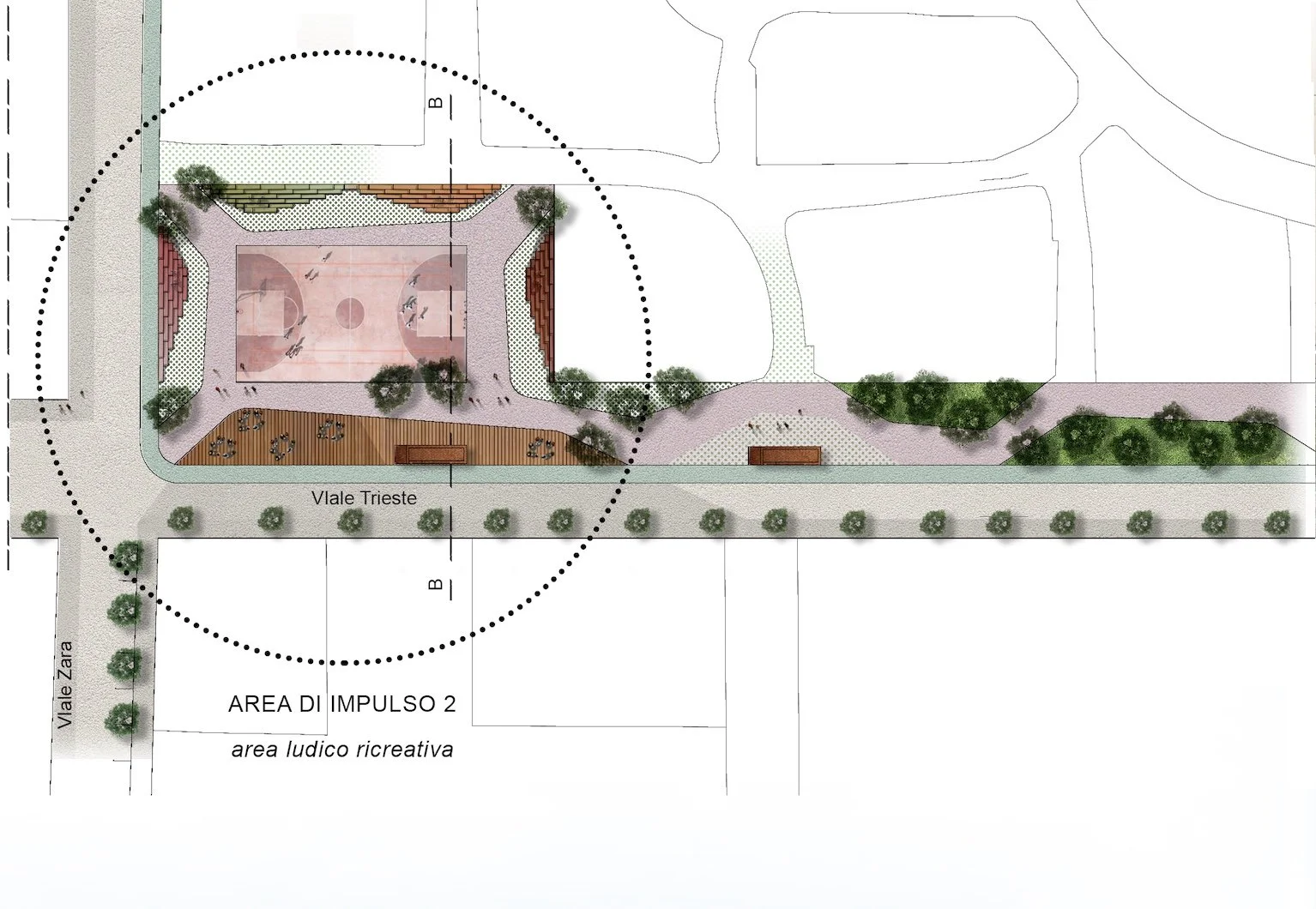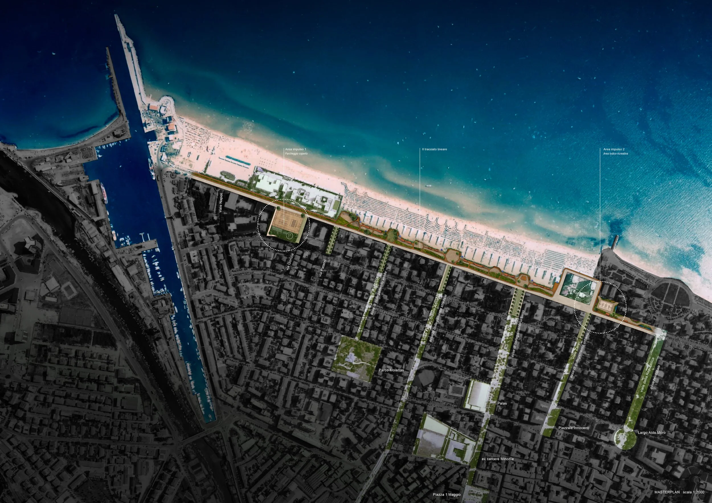 Design quality and consistency with the competition objectives : The proposal is based on a clear, legible urban structure that can be activated in functional phases. In the masterplan, the linear route of Viale Trieste is reinterpreted as a pedestrian and cycle axis, articulated in three sections—south, central and north—marked by viewpoints, panoramic terraces, modular kiosks and new equipped public spaces. The sequence is designed to promote transverse connections (Via Paterni, Viale Marconi, Zara, Rovereto, Fiume), reactivating the city-sea relationship also in its cultural and relational dimension with other urban nodes and hubs. The proposal is based on a clear, legible urban structure that can be activated in functional phases. In the masterplan, the linear route of Viale Trieste is reinterpreted as a pedestrian and cycle axis, articulated in three sections—south, central and north—marked by viewpoints, panoramic terraces, modular kiosks and new equipped public spaces. The sequence is designed to promote transverse connections (Via Paterni, Viale Marconi, Zara, Rovereto, Fiume), reactivating the city-sea relationship also in its cultural