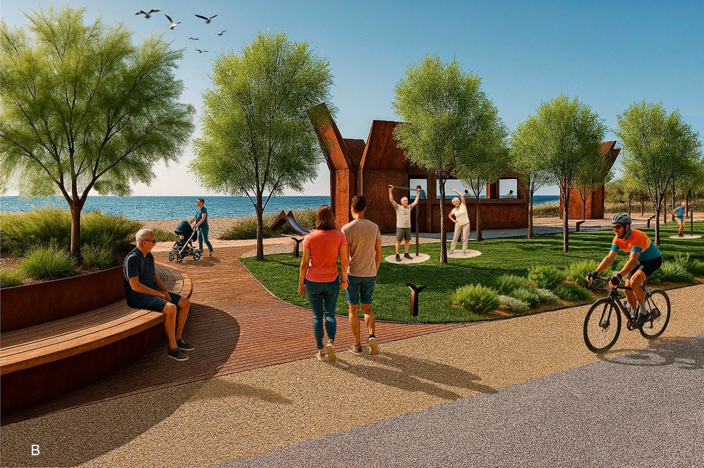 Translate into English: The design proposes six lookout terraces — multifunctional landscape devices, integrated into the urban and coastal fabric — each with its own identity and intended use, built with natural materials and arranged in a rhythmic sequence along the avenue. Specifically:THE ACTIVE WAVE: a terrace dedicated to well-being and physical activity, with multifunctional sports courts, circular seating, and protective vegetation that absorbs and integrates.