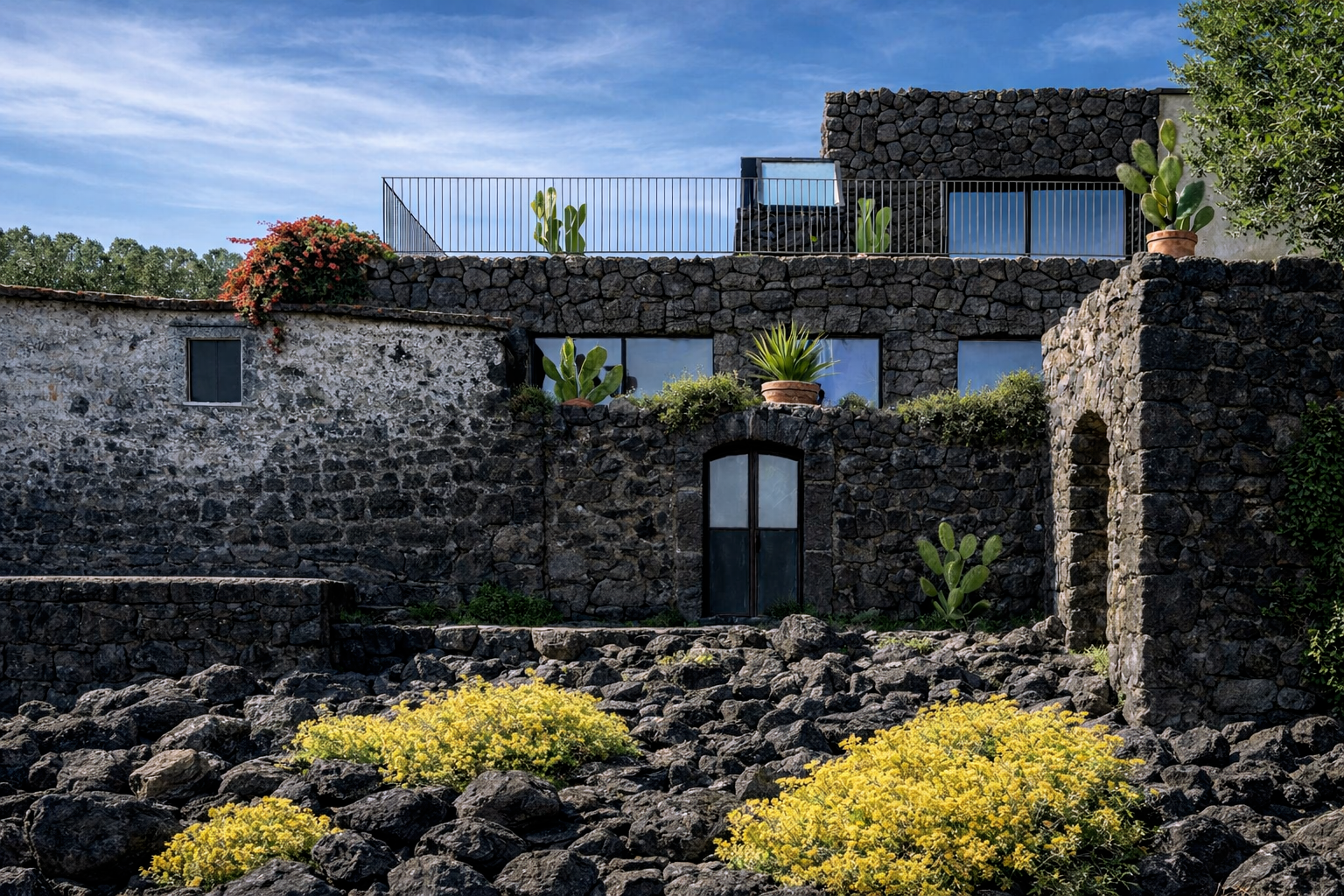 This duality is the soul of Villa Lava. One part looks inwards, towards the historic heart of Santa Tecla, holding on to its past and memory. The other part looks outwards, towards the open sea, with contemporary lines and large openings that connect the interior to nature. The villa is squeezed between three powerful forces: the sea, Mount Etna and the Timpa nature reserve, creating a setting that is both dramatic and intimate.
